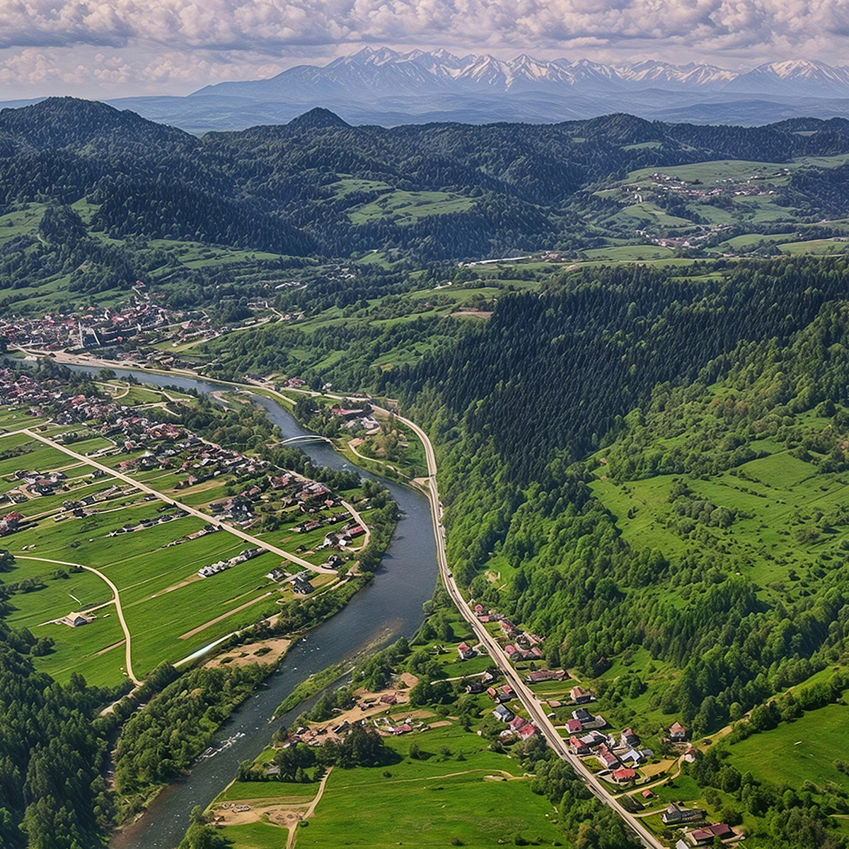 The Dunajec River, picturesquely located in the Pieniny Mountains, flows through small towns, complementing the landscape of the magnificent area.